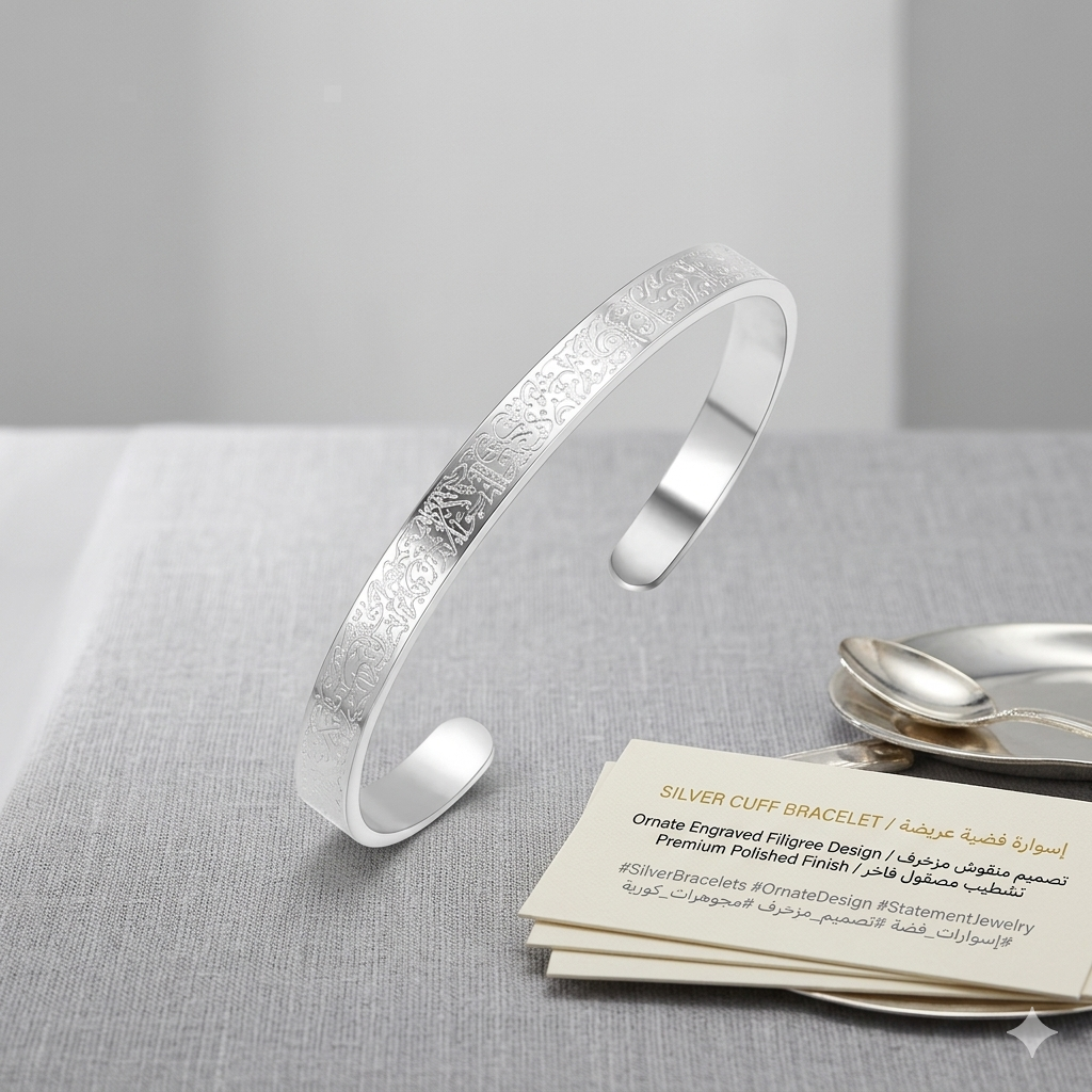 إسوارة “مرايا الزخرفة” الفضية – ستانلس ستيل بتصميم عريض ومنقوش Ornate Engraved Silver Cuff Bracelet – Wide Polished Stainless Steel