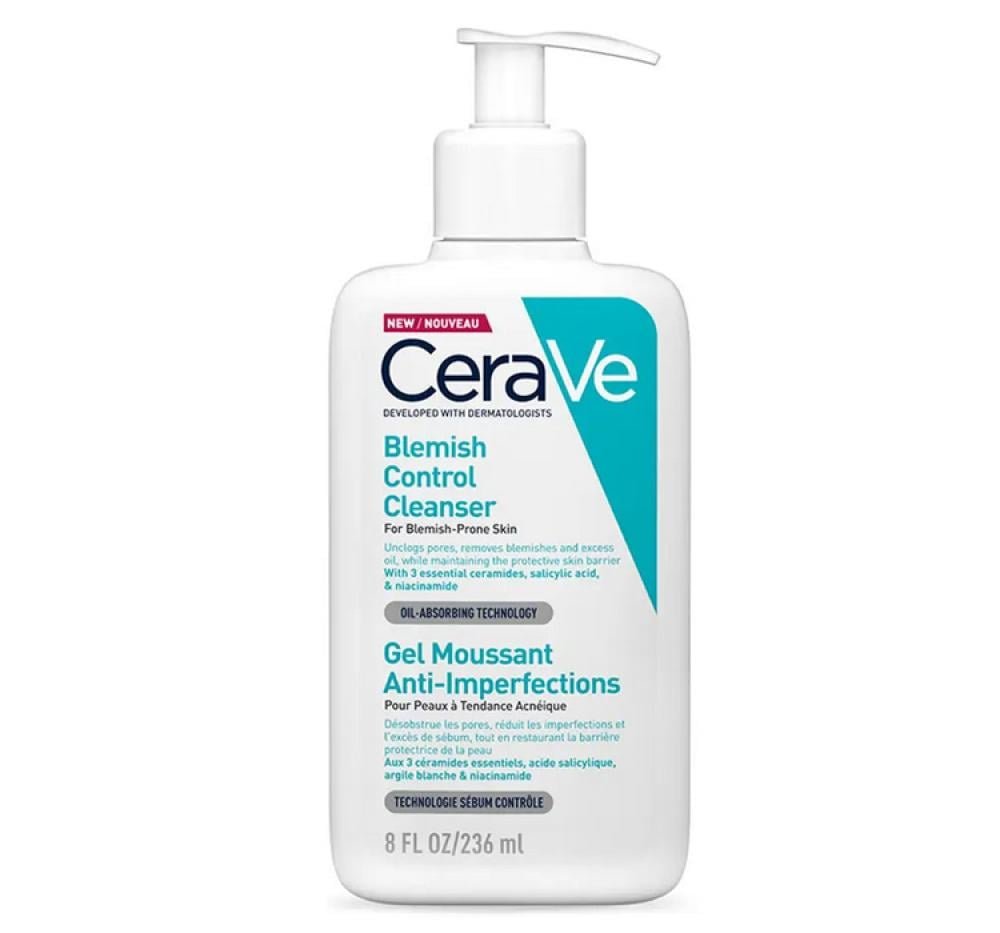 غسول Blemish Control Cleanser من CeraVe مصمم للبشرة المعرضة للحبوب، حيث يساعد على تنظيف المسام بعمق وإزالة الدهون الزائدة والشوائب التي تسبب ظهور الحبوب.